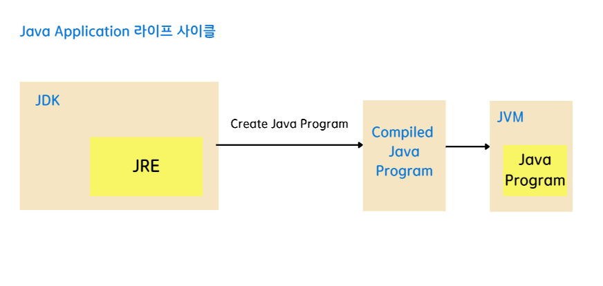 위 화면은 자바 애플리케이션 라이프 사이클입니다. 다음과 같이 JDK안에서 JRE가 구동이 되고 있습니다. JDK를 통해서 컴파일을 하여 자바 프로그램을 생성이 가능합니다.