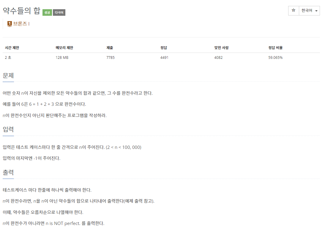 어떤 숫자 n이 자신을 제외한 모든 약수들의 합과 같으면, 그 수를 완전수라고 한다. 예를 들어 6은 6 = 1 + 2 + 3 으로 완전수이다. n이 완전수인지 아닌지 판단해주는 프로그램을 작성하라.
