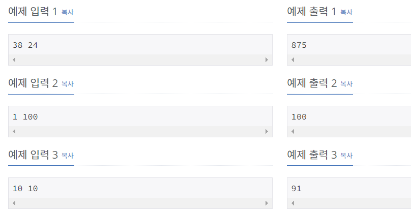 입력은 여러 개의 테스트 케이스로 이루어져 있다. 각 테스트 케이스는 두 정수 M과 F로 이루어져 있으며, 각각은 상근이의 남자 친구의 수와 여자 친구의 수이다. (1 ≤ M, F ≤ 5) 입력의 마지막