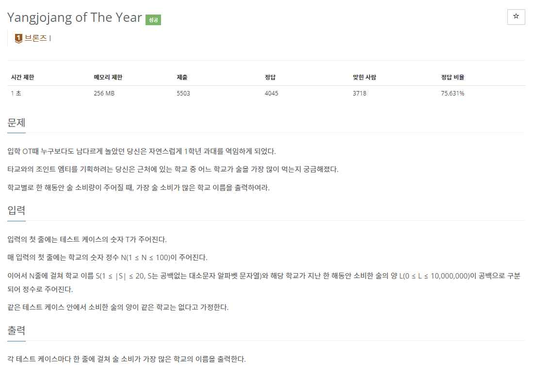 입학 OT때 누구보다도 남다르게 놀았던 당신은 자연스럽게 1학년 과대를 역임하게 되었다. 타교와의 조인트 엠티를 기획하려는 당신은 근처에 있는 학교 중 어느 학교가 술을 가장 많이 먹는지